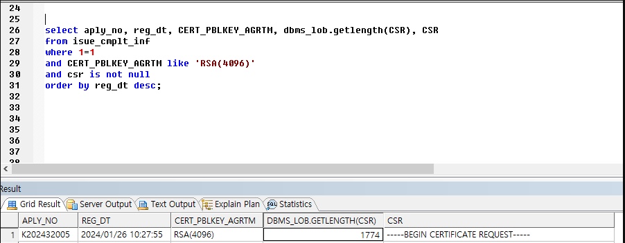 SELECT APLY_NO, REG_DT, CERT_PBLKEY_AGRTM, DBMS_LOB.GETLENGTH(CSR), CSR